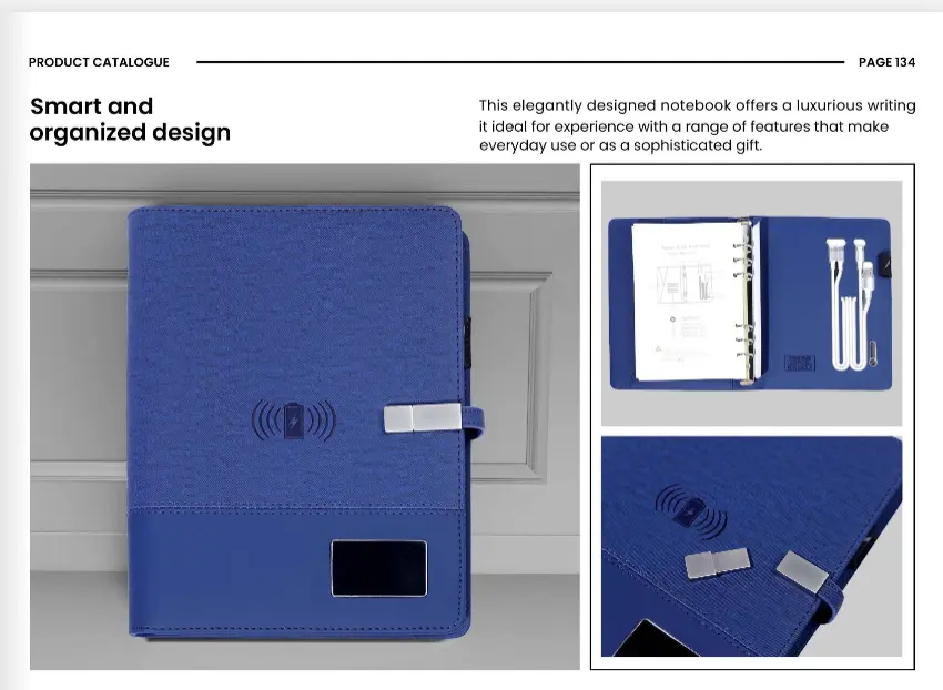 دفتر عملي بتصميم أنيق، مزوّد بخيارات ذكية مثل الشحن اللاسلكي وتنظيم الأدوات، ليكون هدية مثالية للاستخدام اليومي.