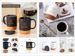 كما يمكن اختيار أكواب السيراميك قاعدة فلين (Cork Bottom Mugs)ذات تصميم مودرن يمنع الانزلاق ويحافظ على حرارة المشروب متوفرة باللونين الأبيض والأسود الفاخر مع غطاء محكم لمنع الرذاذ مما يضمن استخدام عملي المكاتب والموظفين.