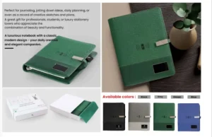 فالغلاف الجلدي الفاخر مع الألوان المتنوعة هي خيارات جذابة تناسب جميع الأذواق مما يجعلها أداة عملية وحديثة في الوقت نفسه، لتصبح هذه المفكرات رفيق متين وعملي لكل موظف خلال أي مناسبة رسمية أو احتفالية داخل الشركة.